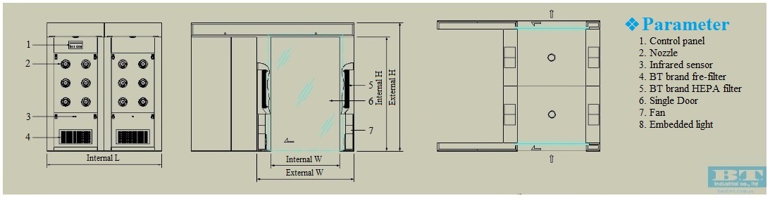 Double electronic interlock is to prevent cross-infection and to achieve sealing requirement.Built-in shutter door control chip can open automatically. Moreover, other conveniences like the infrared probe, transparent window, infrared induction blowing, clear indicartor light, emergency stop switch.